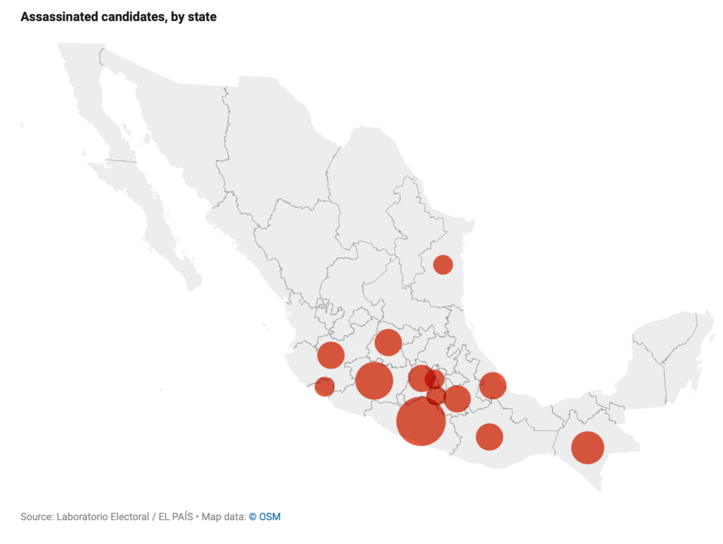 Map of assassinated candidates by state (red circles) shows extreme violence in Guerrero, Michoacán and Chiapas, among other regions