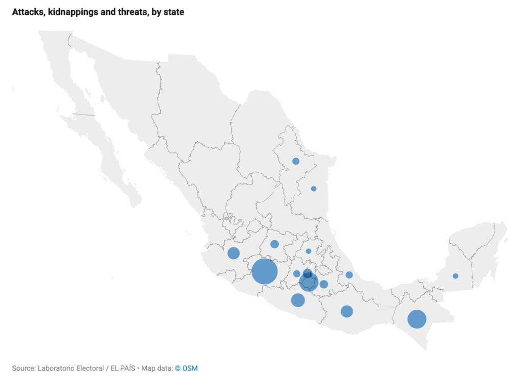 Chart of attacks, kidnappings and threats (blue circles) highlights Michoacán, Chiapas and other states as hotbeds of cartel intimidation, with dozens of candidates forced out of races
